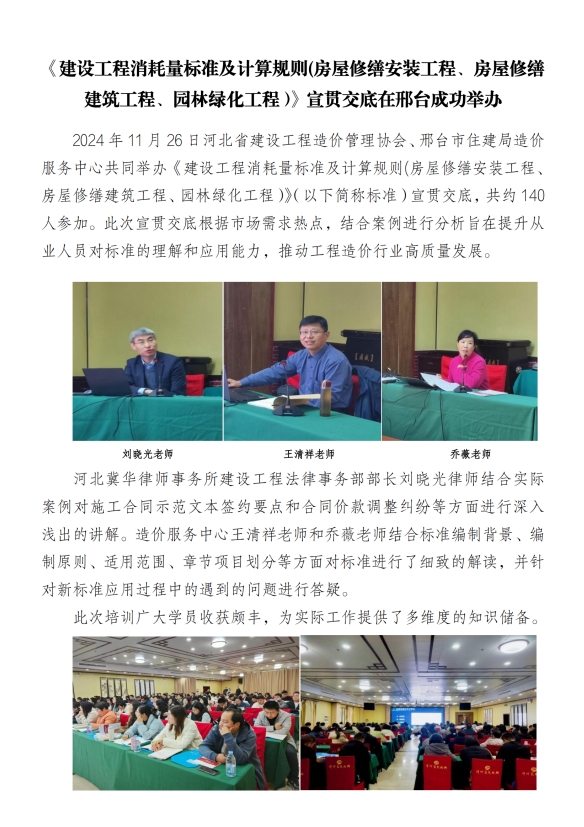 《建设工程消耗量标准及计算规则(房屋修缮安装工程、房屋修缮建筑工程、园林绿化工程)》宣贯交底在邢台成功举办